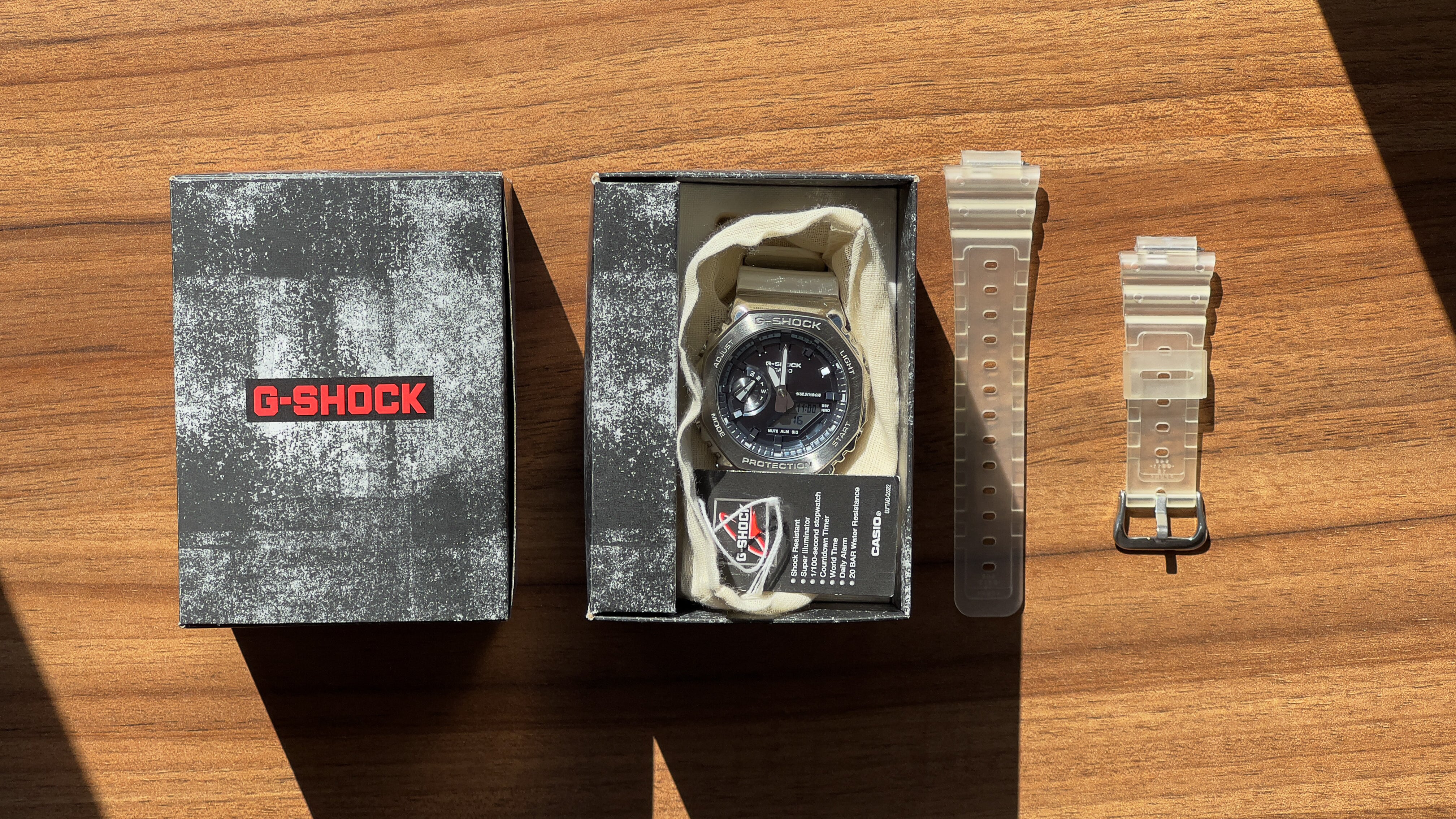 It comes with the original box, the instruction manual, and an extra clear strap, so you’re ready to wear it right away and even switch up the style. With its durable design and versatile features, this G-Shock is perfect for everyday adventures or active lifestyles.